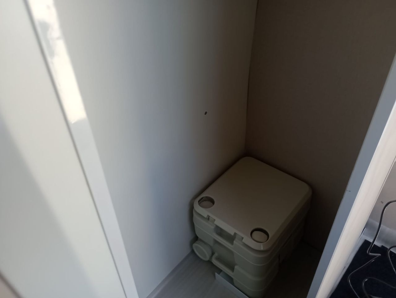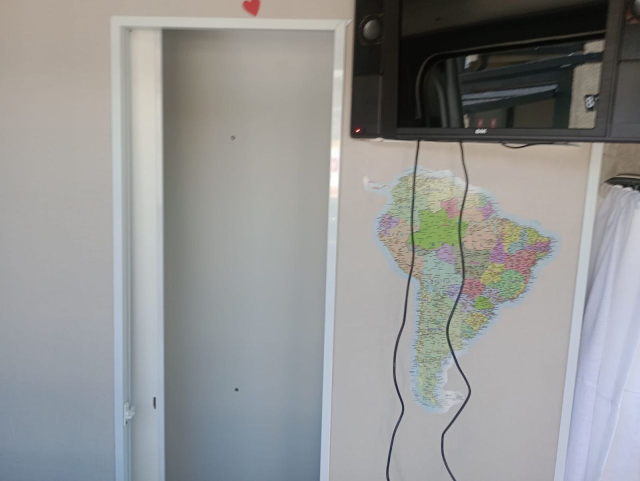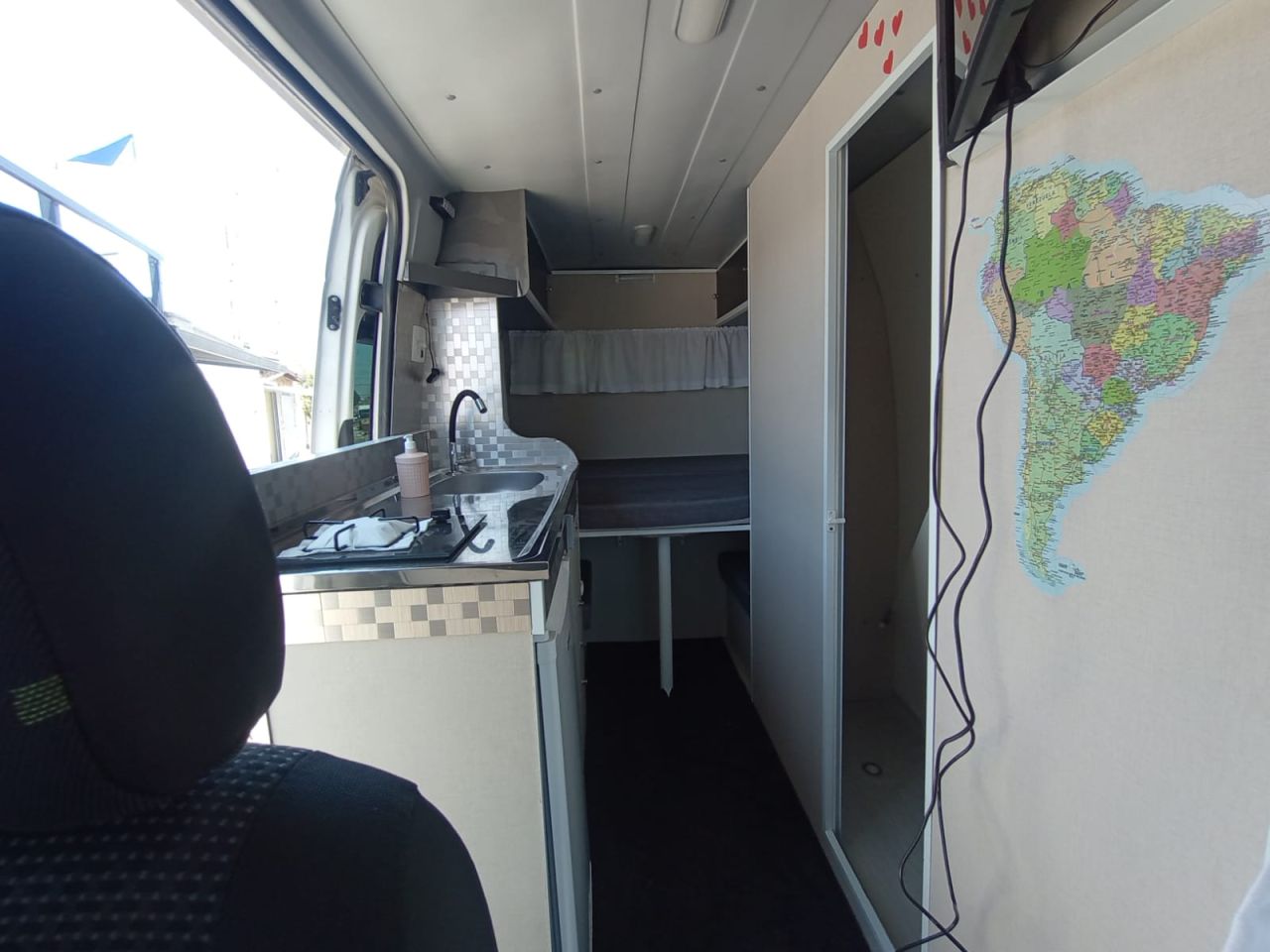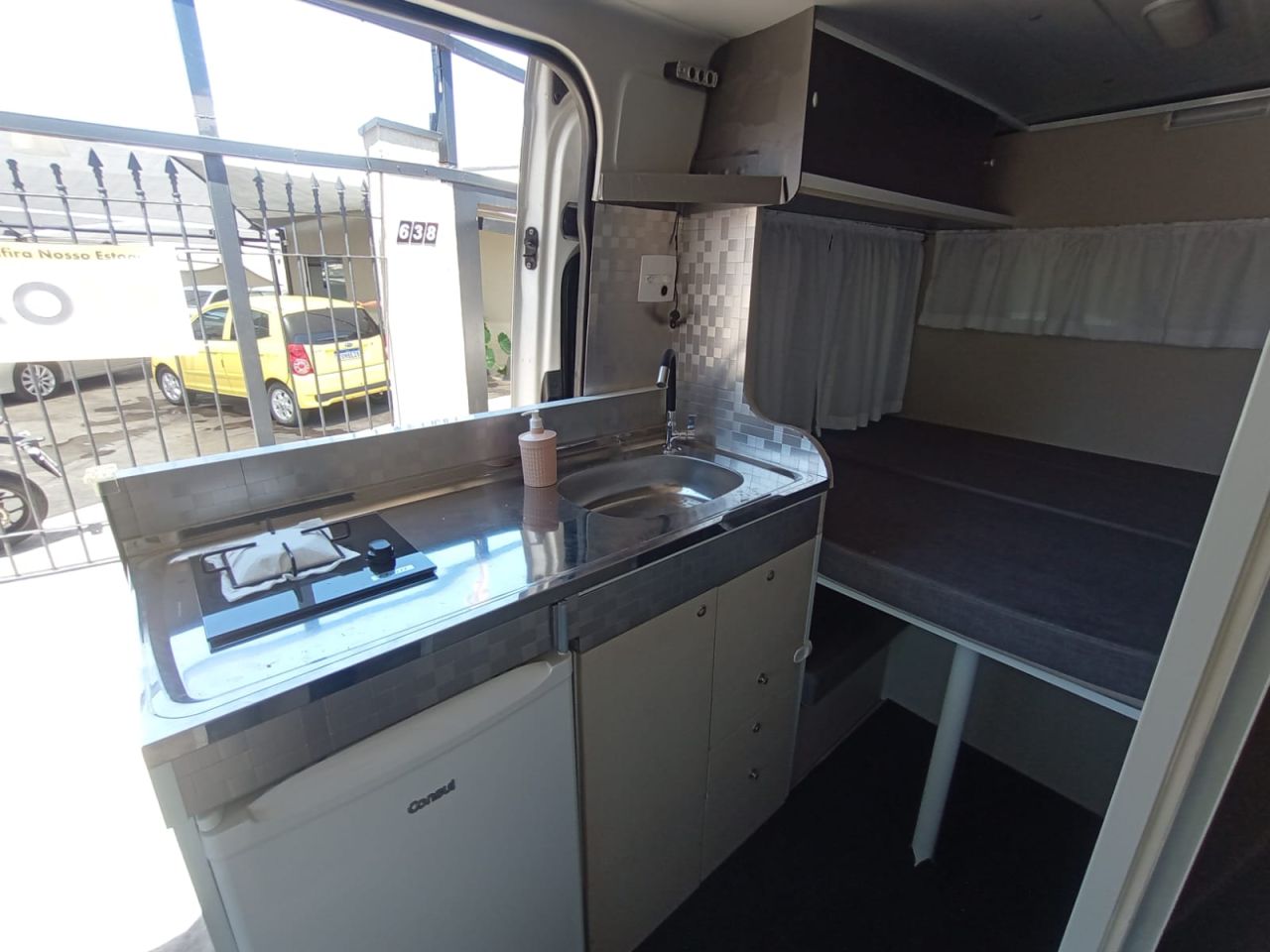 Cozinha completa, banheiro,cama casal e mesa acoplados.